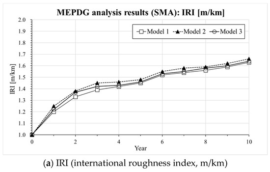 Results of AASHTOWARE analysis for Mixture 2 (SMA): (a) IRI, (b) Rutting, (c) Reflective cracking.