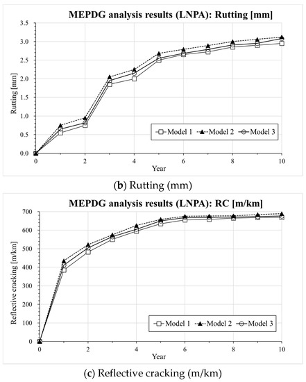 The results presented in Figure 5, Figure 6 and Figure 7 indicate that there is a similar trend in the distress estimation (e.g., IRI, rutting and reflective cracking) for all three different |E*(ω)| master curve models. In all cases, Model 2 (CAM model [33]) presents the highest values compared to Model 3 (SCM model) and Model 1 (sigmoidal model) which show the intermediate and lowest level of distress estimation, respectively. The differences in IRI prediction are not that significant among the three models except for the LNPA case, for which the presence of a high degree of air voids might ultimately affect the evolution of this parameter. However, distinct upper and lower bounds on rutting and reflective cracking are obtained for all tested cases. In the previous section, a higher |E*(ω)| could be predicted with Model 1 (sigmoidal) compared to Model 3 (SCM model). This reflects in the actual response of the pavement predicted with the AASHTOWare software. It also needs to be mentioned that the results of the MEPDG analysis performed with Model 2 (CAM model [33]) might be not necessarily very robust as a poor prediction of dynamic modulus and phase angle at a higher temperature and low frequency was observed (deviation from the experimental data). In view of the plots presented in Figure 5, Figure 6 and Figure 7, while the MEPDG output of Model 1 (sigmoidal) and Model 3 (SCM) appears to be relatively close, the latter provides a more conservative prediction of the evolution of the pavement distresses (higher degree of distress). Such preliminary results may suggest the opportunity of incorporating the SCM model in the design software to guarantee a potentially more reliable approach to the pavement design procedure eventually leading to longer lasting road infrastructures.