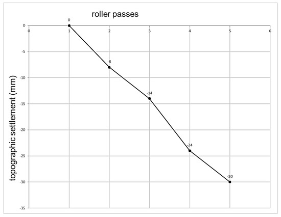Another significant control test is the topographic settlement. There is a standard procedure test in which the last roll pass must be under 1% of the thickness of the compacted layer. This settlement must be measured after the first roll pass. Figure 2 shows the experimental verification of how this criterion has easily exceeded the settlement threshold at the first pass. Additionally, there are undefined indicators in the arrangement of the dots, their spacing, and how they were measured.