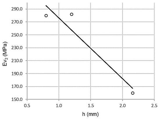 As shown in Figure 7, there is a high correlation between the wheel-tracking test and the second modulus of the plate bearing test (Φ 762 mm), with inverse proportionality. In this case, there are high values for the wheel-tracking test corresponding to low values for the second modulus plate bearing test, although a larger sample would be necessary to completely ascertain it.