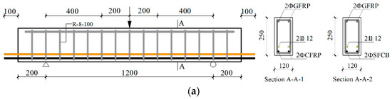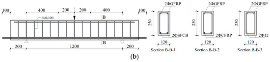 As depicted in Figure 2, nine simply supported reinforced concrete beams were prepared, including 6 specimens for the hybrid-reinforced concrete beams and 3 specimens for the single-reinforced concrete beams. The dimension of the rectangular cross-section was 120 mm in width and 250 mm in height with a concrete cover thickness of 20 mm. For the hybrid-reinforced concrete beams, the CFRP bars and SFCBs were configured in the lower layer of the section, while the steels were arranged in the upper layer (i.e., 30 mm higher). For the single-reinforced concrete beams, the material of the reinforcement was selected as steel, CFRP bar, and SFCB, respectively. The erection and stirrup were selected as glass fiber bars with a diameter of 8 mm.