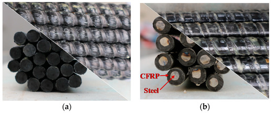 Experimental reinforcement: (a) carbon fiber reinforced polymer (CFRP) bar, (b) steel fiber reinforced polymer composite bar (SFCB).