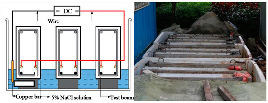 In order to accelerate the dry–wet cycles corrosion, the electricity-accelerated precorrosion test was first performed for the steel bar in the 6 hybrid-reinforced concrete beams with a target corrosion ratio of 5%. After the surface concrete cracked at the level of upper steel, the beams were subjected to the dry–wet cycles corrosion with 5% NaCl solution and protected by the ICCP system simultaneously for 180 days. The detailed information of the experimental design is listed in Table 1. The specimen is named with the following principle: UP means that the ICCP system was not activated; CP means that the ICCP system was activated; RE means without dry–wet cycles corrosion; S represents the controlled beams with single row reinforcements. For example, CFRP-CP is the hybrid-reinforced concrete beam (steel for the upper layer and CFRP bars for the lower layer) with the activated ICCP system under the dry–wet cycles environment.