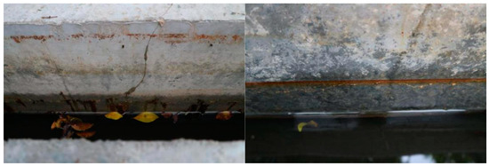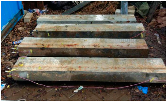 As a simulation of the tidal action for seawater, the dry–wet cycles can reflect the real corrosion environment, and the corrosion state of steel bars can be identified. Due to the limitation of lab conditions and specimens, the outdoor dry–wet alternate environment was utilized here: The concrete specimen was fully infiltrated in 5% NaCl solution every morning and evening, and then dried by natural air. As shown in Figure 6, the experiment was located outside the school of civil engineering at Shenzhen University, and the corrosion lasted for 180 days.