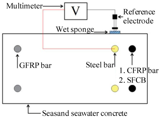 Aiming at these issues, to further inhibit steel corrosion in a high chloride environment and take advantage of the dual-functional CFRP without the drawback of interface adhesive, the ICCP technique was applied to the hybrid-reinforced concrete (RC) beam with internally embedded CFRP bars and SFCB as the anode material in this paper, as shown in Figure 1 (the RC beam can be seen in Figure 2). In the hybrid-reinforced concrete beams, the anticorrosive CFRP bars and SFCBs were arranged in the lower layer while the ductile steel bars were arranged in the upper layer. The effect of the new ICCP system on the flexural performance of the hybrid-reinforced concrete beam subjected to corrosion was verified experimentally. First, to accelerate the dry–wet cycles corrosion in the whole process, an electricity-accelerated precorrosion test was performed for the steel bar in the hybrid-reinforced beams with a target corrosion ratio of 5%. Then, the dry–wet cycles corrosion was conducted and the ICCP system was activated simultaneously for the hybrid-reinforced concrete beam for 180 days. Finally, the three-point flexural experiment was carried out for the simply supported hybrid-reinforced concrete beams. After the tests, the steel bar was taken out from the concrete to quantitatively measure the steel corrosion. Results showed that the process of steel corrosion could be inhibited effectively by the ICCP treatment with the CFRP bar and the SFCB as the anode material. Additionally, the ICCP system showed an obvious effect on the flexural performance of the hybrid-reinforced concrete beams, especially for the CFRP anode. Compared with the SFCB anode, the ICCP system with the CFRP bar as the anode was more effective for the hybrid-reinforced concrete beam to prevent the steel corrosion. In general, the key issue of this paper was to investigate the flexural performance of hybrid RC beams with CFRP bar or SFCB as the anode material in the ICCP system subjected to corrosion, leading to the differences in CFRP type and test contents compared with other references [26,28]. Furthermore, considering the sea sand and seawater utilized and dry–wet cycle corrosion performed in this experiment, it can be inferred that the new ICCP system is a promising method to protect the steel bar subjected to the marine environment, and can further promote the utilization of sea sand and seawater in civil engineering.