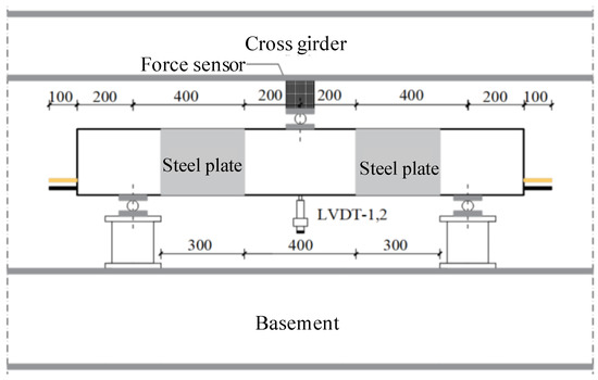 As depicted in Figure 8, the three-point bending test was conducted for all the concrete beams with a 10,000 KN hydraulic long column testing machine (Hengle, Jinan, China). Displacement control was selected, and the loading rate was 0.5 mm/min. We kept loading until the following situations occurred: (1) Concrete crush, or (2) reinforcement rapture, or (3) shear failure. To avoid the shear failure mode for the hybrid-reinforced concrete beam, the steel plate was used to improve the shear capacity.