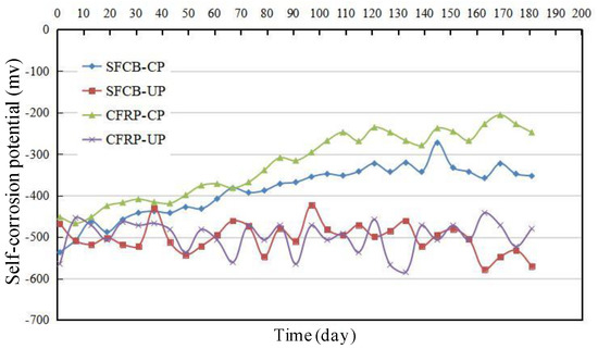 After the start of the dry–wet cycles corrosion, the ICCP treatment was performed for the specimen. As shown in Figure 1, the CFRP bar or SFCB in the lower layer was connected to the positive pole, while the steel bar in the upper layer was connected to the negative pole. The self-corrosion potential of the steel bar was measured twice a week, as shown in Figure 7. The protection current density was set to 198 mA/m2 and 248 mA/m2 for CFRP bars and SFCB, respectively.
