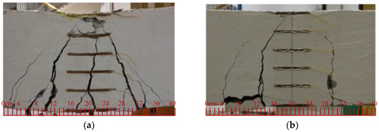 In this experiment, the Dewsoft dynamic data acquisition box was utilized to collect the data of force sensor, displacement sensor, and strain gauge with a frequency of 1 Hz. The measuring content is described as follows: (1) Load measurement: A force sensor with a range of 475 kN was placed on the steel pad to measure the applied load; (2) deflection measurement: Two displacement sensors with a range of 50 mm were placed on the mid-span of the test beam to measure the mid-span vertical displacement; and (3) crack measurement: A fracture tester was utilized to measure the maximum crack width in the curved shear section.