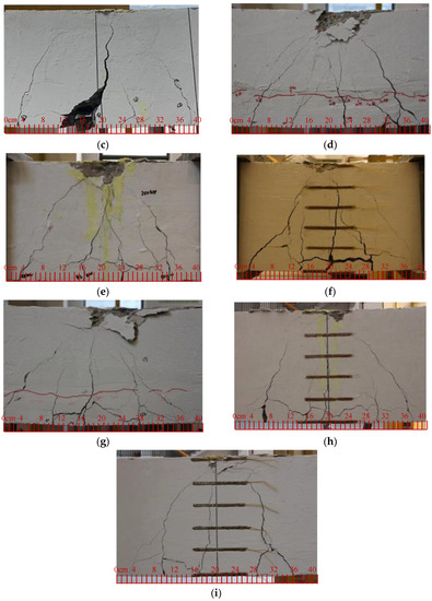 Failure modes of the test beams: (a) Steel-S, (b) SFCB-S, (c) CFRP-S, (d) SFCB-RE, (e) SFCB-UP, (f) SFCB-CP, (g) CFRP-RE, (h) CFRP-UP, (i) CFRP-CP.