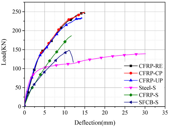 The load-deflection curves for the RC beams configured with SFCB and CFRP bars are plotted in Figure 11 and Figure 12, respectively. It has to be mentioned that the load-deflection curves for CFRP-CP, CFRP-UP, SFCB-CP, and SFCB-UP are related to the duration of the dry–wet cycles corrosion. Before cracking, the load-deflection curve increased linearly, and the stiffness for the single-reinforced concrete beam was obviously smaller than that of the hybrid-reinforced concrete beam. After cracking, there was a slight decrease in the stiffness for all the beams. As the load continued to increase, the core steel inside the SFCB first yielded, and then the tensile load was sheared by the externally wrapped CFRP, leading to the post-yield stiffness for SFCB. The final ultimate capacities of CFRP-S and SFCB-S are namely 34.28% and 6.74%, larger than that of Steel-S.