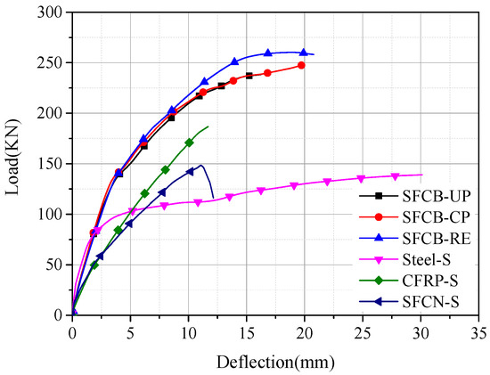 Load-deflection curves for the hybrid-reinforced beams with SFCB.