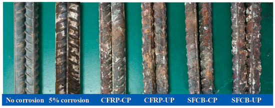 After the bending test of the concrete beam, the steel bar was taken out, and the morphology is depictured in Figure 13. It is noted that the steel labeled with 5% corrosion refers to the precorrosion in Section 2.3.2. By visual inspection, it can be observed that, compared with the steel bar without corrosion, the surface of the steel bar in the specimen with 5% corrosion changed to a darker color. Compared with the steel bar with ICCP treatment (i.e., CFRP-CP and SFCB-CP), the rib transverse on the surface was less obvious and the corrosion was more serious for the steel bar without ICCP treatment (i.e., CFRP-UP and SFCB-UP), indicating that the ICCP treatment was conducive to inhibit steel corrosion with CFRP bar and SFCB as anode. Compared with the steel bar in the CFRP-CP specimen, the corrosion was more serious for the steel bar in the SFCB-CP specimen, indicating that the effect of the ICCP treatment on the inhabitation of steel corrosion was more obvious for the CFRP bar anode.