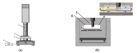 The experimental device for the ultrasonic assisted hot-pressing technology: (a) ultrasonic welding machine (1-ultrasound vibration press head, 2-mold, 3-heating table, 4-controller); (b) mold diagram (5-adiabatic handle, 6-pressed steel plate).