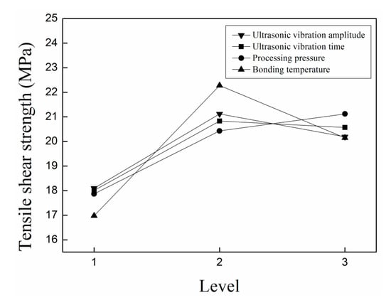 As shown in Table 4, there are significant differences for the tensile shear strength of polypropylene/aluminum alloy hybrids under different forming conditions. The tensile strength ranges from 11.55 MPa to 22.43 MPa. According to the data from Table 5, it can be found that the influence of bonding temperature on the tensile shear strength of specimens is the most significant factor, and ultrasonic vibration amplitude and processing pressure are the secondary factors, while the influence of ultrasonic vibration time on the tensile shear strength of polypropylene/aluminum alloy hybrid the lowest.