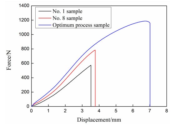 The tensile shear properties of several typical UAHPT processed samples are described in Figure 4. The displacement and maximum load for the No. 1 specimen are only 3.5 mm and 577 N, respectively, when the sample interface fails. For the No. 8 sample, the failure displacement increases by 0.3 mm and the load increases by ca. 403 N in comparison with No. 1 sample. Applied with the optimum UAHPT processing parameters, the tensile load increases sharply and up to 1159 N. Meanwhile, the failure displacement reaches up to 7 mm. This shows that the bonding properties of polypropylene/aluminum alloy hybrids are effectively improved for applied the ultrasonic-assisted hot-pressing process.