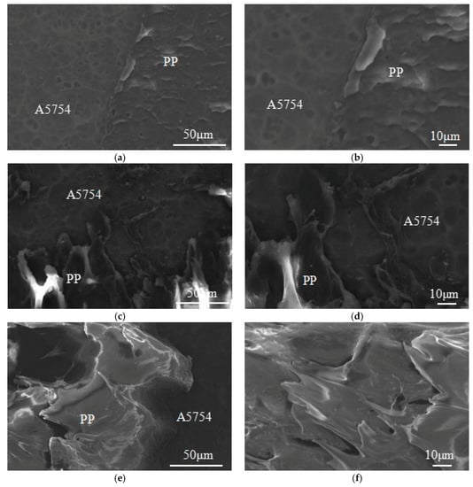 The fracture behavior is closely related to metal surface morphology. The aluminum alloy surface was treated by phosphoric acid anodization, and the corresponding surface morphology is shown in Figure 7a,b. It is intuitive to see that there are many needle honeycomb-like holes on the anodized aluminum alloy surface, where the micropore size ranges from 150 to 200 nm. When the microstructures are magnified, it is found that the micropores are very close together and some holes run through each other. During the UAHPT process, under the combined effects of ultrasonic vibration and processing pressure, the plastic melts tend to flow into the needle-shaped honeycomb-like microstructure holes, forming the micro-rivet structures to strengthen the adhesion of the aluminum alloy and polypropylene after the polypropylene solidifies.