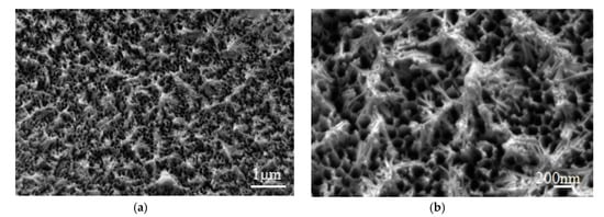 The microstructures of the anodized aluminum alloys surface: (a) ×10,000, (b) ×30,000.