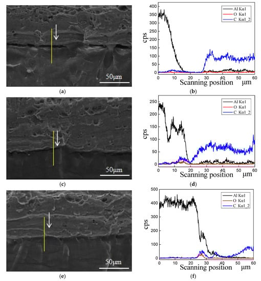 To understand the binding mechanism at the joint interface of polypropylene and aluminum alloy, the SEM with line scan chemical analysis was applied to investigate the microstructures and atomic diffusion at the interface. The micrographs of cross-section and atomic migration at the interface for the single-lap samples prepared by different vibration conditions were shown in Figure 9. Among them, the transverse coordinate is the scanning position of the sample, and the longitudinal coordinate represents the characteristic X-ray counting intensity of the element are shown in Figure 9b,d,f. The content of the element can be determined qualitatively by the trend of cps. As shown in Figure 9a, there are relatively obvious gaps at the joint interface in the cross-section view for the No. 1 sample, which indicates that there are few micro-interlocking structures at the interface of PP and aluminum alloy during the UAHPT process. Processed under the optimized UAHPT processing parameters, the gaps at the interface for No. 8 sample reduced as displayed in Figure 9c, and the PP resin and aluminum alloy are tightly closed at the interface for the optimized processed sample, as shown in Figure 9e. The tightly close interface or the optimized processed sample means most of PP resin flowed into the micro-holes on the Al surface with strong adhesion than that of No. 1 and No. 8 samples. It can be concluded that the strong joint strength for the optimum processed specimen is mainly attributed to many PP resin flowing into the needle-shaped, honeycomb-like pores, and forming interlocking microstructures.