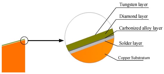It is necessary to test the inter-layer bonding strength, which may influence the diamond composite anode’s scattering and other properties. The test was completed directly by cross-section characterization and analysis. The layers consist of the tungsten film, the diamond heat buffer layer, the metallization layer, the solder layer and the copper substratum. Scanning electron microscopy (SEM) [] was used to observe the inter-layer smoothness and coverage.