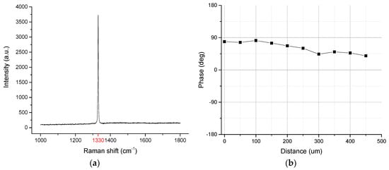 Figure 2a shows the Raman spectrum of a diamond film. In the figure, a characteristic absorption peak for diamond exists at 1330 cm−1, and is an absence of absorption peaks for other non-diamond carbon structures. Figure 2b shows the thermal diffusion coefficient of diamond measured with photo-thermal deflection (PTD) thin-film thermal conductivity test system []. Thermal conductivity was derived from the measured thermal diffusion coefficient. Therefore, the diamond layer parameter in this study included a thickness of 0.5 mm, a thermal conductivity of 1893 W/m K, and a thermal stress coefficient of 1.2 × 10−6/°C.