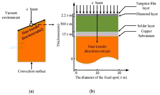 According to experimental conditions and the properties of the materials constituting the diamond composite anode, the heat transmission experimental procedure can be turned into a two-dimensional unsteady heat transfer model, as shown in Figure 3a. This was due to the requirement of establishing a systematical heat transfer model before conducting finite element analysis. Figure 3b shows the magnified cross-section of the diamond composite anode at the focal spot region. Due to the diameter of the electron beam spot being far smaller than that of the composite anode, the analysis was approximated to the area where the electron beam bombardment was actually on the tungsten film. Therefore, one assumption was that this smaller specific area heated up evenly. Therefore, the heat generated by the electron beam bombardment transferred to the interior of the diamond composite anode evenly.