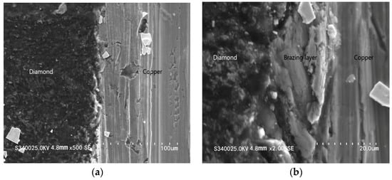 In Figure 4, the cross-sectional images of the composite anodes show the bonding results between layers after the interfacial reaction, observed by a SEM. Figure 4a is the cross-sectional image of the diamond composite anode, magnified 500 times, in which the brazing position shows smoothing and no obvious gap or crack can be identified in the diamond heat buffer layer (dark black) or the copper substratum (light grey). Figure 4b is the cross-sectional image of the diamond composite anode’s soldering layer, magnified 2000 times, in which no obvious splits can be identified in the diamond heat buffer layer or the copper substratum. There is no obvious separation between the solder layer and the diamond heat buffer layer. It can be concluded that there was wetting of diamond heat buffer layer, solder, and copper substratum.