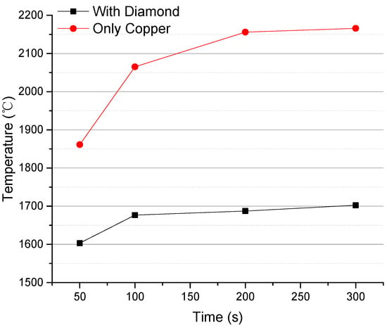 Figure 5 shows the variation trend over time for the composite anode’s surface temperature. The surface temperature of the anode with a diamond buffer was always much lower than that of a tungsten film anode, at any time. For example, at 50 s, the surface temperature difference was 258 °C, and at 300 s, the surface temperature difference was 463 °C. Hence, the new X-ray reflective anode with the diamond heat buffer layer introduced in this study is a breakthrough in research for heat dissipation in a focal spot region of a micro-focus X-ray anode.
