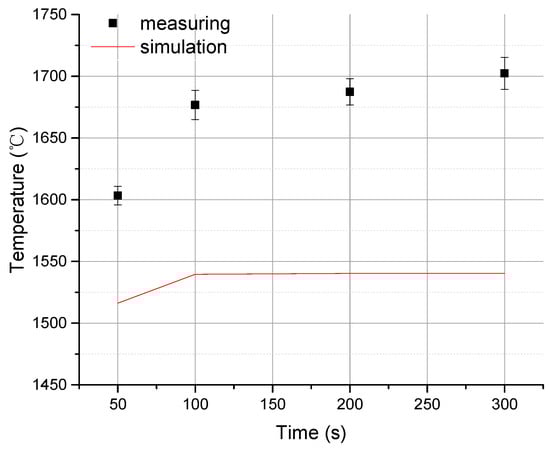 Figure 6 shows the anode surface temperature values obtained at different times by modeling and simulation using the finite element method, as well as the mean of triplicate experimental measurements. In Figure 6, the point represents the change of the maximum temperature value of the measured focus position with time. The straight line represents the change of the maximum temperature value of the simulation focus position with time. It also indicates the maximum temperature change process when the focus changes from non-thermal equilibrium to thermal equilibrium.