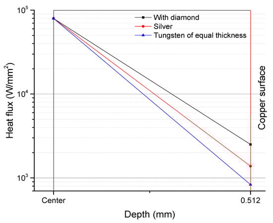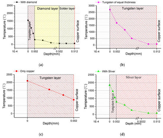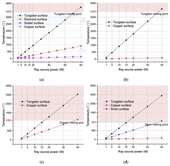 To prove the superiority of the new diamond buffer layer anode in all conditions, two aspects, the temperature and heat flux of each layer, were analyzed. Figure 7 shows the highest temperature value at the focal spots in each layer of the four types of compared anodes. Temperature comparisons between type (a) and type (b) demonstrate that the composite layer (the part above the surface of the copper substratum) of type (a) is as thick as the entire tungsten plate of type (b). As shown in Figure 7b, the temperature on the surface of the anode was different from that on the surface of the copper substratum. This results in the temperature on the surface of the anode at the focal spot quickly reaching the melting point of tungsten, were even at a low power for X-ray generation. Comparisons between type (a) and type (c) indicate that type (c) contains a much thinner tungsten film which allowed for heat transfer to the copper substratum rapidly, but too much heat transfer into the copper substratum will melt the copper substratum at the focal spot even if the tungsten film remains solid. Comparisons between type (a) and type (d) show that type (d) contained silver with the highest thermal conductivity as its heat buffer layer. Under the same conditions, type (d) performed similarly in its response to variation in temperature to type (a), but since silver has a low melting point it will break down much sooner than type (a) as the power increases. Damage to the anodes occurs mainly because the excessive electron beam energy concentrates at the focal spot in the tungsten film. Therefore, the heat flux per unit area for the focal spot region becomes higher at a node in the vertical heat distribution. This can be further verified by calculating the heat flux distribution of each layer.