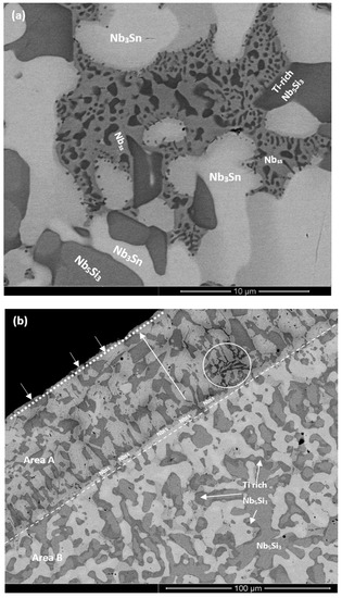A cross section of the alloy ZX6 is shown in Figure 7c. The scale was less porous than that of the low Sn alloy ZX5 and its thickness was about 10 μm, similar with the alloy ZX4. There were cracks in the Nb5Si3 and Nb3Sn intermetallics that were mostly parallel to the scale/substrate interface and appeared to be more severe in the Nb5Si3 than in the Nb3Sn. The depth of the diffusion zone, which is shown by the dashed line in Figure 7c, was about 30 μm, smaller than that of the low Sn alloy ZX5. Considering the contrast of phases in the diffusion zone and bulk in Figure 7c, both the prior eutectic and the Nb3Sn exhibited darker contrast in the diffusion zone, but the contrast of the Nb5Si3 grains was the same in the two areas. The contamination of the microstructure by oxygen had progressed along the Nbss.