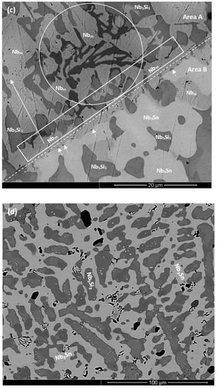 In the alloy ZX6, the most severe macrosegregation was also observed between the bottom and bulk of the button, and the bottom was leaner in both Si and Ti. The microstructure consisted of the βNb5Si3, Nb3Sn, and Nbss phases (Figure 2a and Figure 4c and Table 1) with larger volume fractions of Nb3Sn and Nbss + βNb5Si3 eutectic in the bulk, and low volume fractions of the eutectic and the Nbss in the bottom of the button. A zone about 50 μm thick consisting of Nbss and βNb5Si3 with some Ti rich Nb5Si3 was formed next to the crucible wall (Figure 2b). Then, there was a change in microstructure to one consisting mainly of Nb3Sn and βNb5Si3 with a strong segregation of Ti in the latter (Figure 2c) and a very low volume fraction of Nbss and no Nbss + βNb5Si3 eutectic. The transition appeared to have started from a thin layer of uniform thicker Nbss that had formed parallel to the crucible wall (dotted line with short arrows in Figure 2b). The Nb3Sn was present at a higher volume fraction in the bottom of ZX6. The Ti concentration in the Nbss was high (Supplementary Table S3).