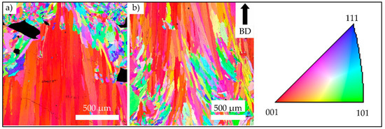 Figure 5a shows the transition point from the lower specimen grip section, i.e., bulk material, to the strut. The bulk material is characterized by a strong < 001 > texture parallel to BD. Upon transition into the strut, the microstructure significantly changes. Grain morphology is equiaxed and texture intensity is weak, respectively, and lack of fusion defects concomitantly occur (see Figure 5a). Within the transition area from the strut to the upper bulk part of the specimen, as seen in Figure 5b, the microstructural appearance changes the opposite way, i.e., from hardly textured and equiaxed microstructure to strongly textured and columnar grains.