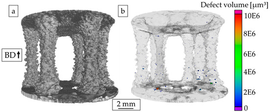 A reconstructed µ-CT volume of an exemplary specimen with a strut diameter of 2 mm is shown in Figure 6a. As can be seen, the specimen surfaces are characterized by an irregular topography. In particular, partially melted powder particles can be detected, and “plate-pile” like stacking defects are present. Further on, the process-induced pores and their locations inside the corresponding strut specimen are presented in Figure 6b. The resolution limit of the µ-CT at the given working point was 12 µm.
