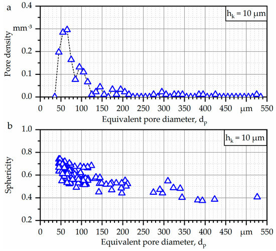 Furthermore, a quantitative analysis of the prevailing defects was carried out, as shown in Figure 7. Figure 7a highlights the pore density as a function of the equivalent pore diameter dp. The equivalent pore diameter is divided into classes (dp−5, dp+5) in order to assist analysis. The total analyzed volume for the investigated specimen was around 91 mm3, and the relative density was found to be > 99.9%. With regard to the pore density, the overall number of pores was found to be low, and only one pore exhibited an equivalent pore diameter > 500 µm. Additionally, it can be stated that both spherical and elongated pores could be found (Figure 7b). The biggest pore, which also had the lowest sphericity, was located close to the transition to the lower specimen grip section. As stated before, the grip section itself was not part of the investigations.