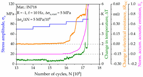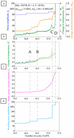 Typically, material changes are captured by means of the plastic strain amplitude; however, Piotrowski et al. [52] demonstrated that temperature and resistance measurement techniques can be used supplementary to gain additional details about the cyclic behavior of a material. Temperature changes during fatigue tests can be straightforwardly attributed to dissipated energy resulting from plastic deformation [52,53]. However, the change of electrical resistance is a more complex measure. Besides being affected by geometry induced changes of component cross sections, the electrical resistance depends on the specific electrical resistance, which is known to be influenced by the actual defect density and the effective cross section being affected by crack initiation and propagation [52,53]. Mostly, it is assumed that the determined physical values can be directly correlated to the actual fatigue state and, thus, the damage progress. However, a complex interaction of signals has been revealed [23] such that a simultaneous application of several measuring techniques should be considered. In the literature [53,54], the combination of these techniques has been successfully applied for the detailed evaluation of the fatigue behavior of various steels and lightweight alloys.