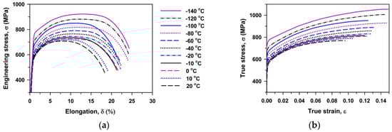 Engineering stress–elongation curves (a) and true stress–strain curves (b).