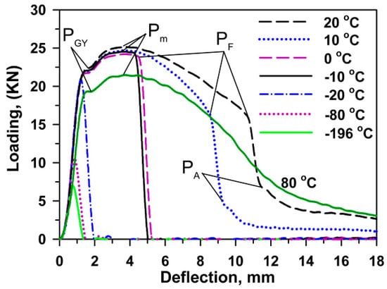 The impact toughness of the 10% Cr steel was studied in a previous paper [21] and can be briefly summarized here as follows. DBT corresponding to a half between the upper and lower shelf energies was observed at 10 °C. The upper shelf region with an energy of 335 J/cm2 is located at T ≥ 80 °C, and the lower shelf region is situated at T < −40 °C. The fracture appearance transition temperature (FATT) corresponding to the 50% of ductile surface fracture matches DBTT. The 28 J transition temperature, T28J, is about −27 °C. Typical impact load–deflection curves obtained at various temperatures are represented in Figure 3. The maximum loads, Pm, the general yield loads, PGY, the well-defined specific loads, PF, corresponding to the unstable crack propagation, and the loads for the fracture arrest, PA, [12,25] are marked in Figure 3.