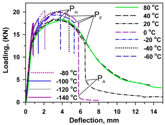 Load–deflection curves obtained during the three-point bending tests at different temperatures. Pm is the maximum load, PF is the cleavage fracture load, PA is the arrest load.
