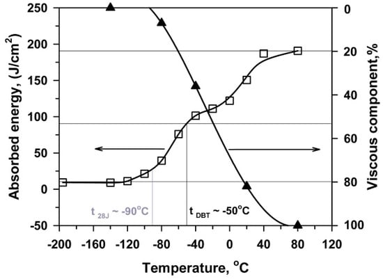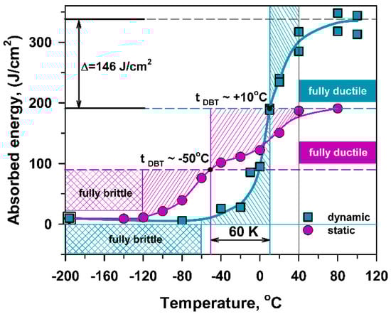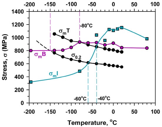 According to the Yoffee diagram [31,32,33,34], the brittle fracture should occur at temperatures below an intersection of the σ0.2 and σm curves for different types of loading, i.e., σmI and σmB for impact and three-point bending tests, respectively (Figure 9). Under dynamic loading, the temperature of the σ0.2 and σmI intersection is higher than that for the static loading (three-point bending tests). These characteristic temperatures of −150 °C and −60 °C for the static and dynamic loading, respectively, can be considered as the temperatures of embrittlement. This is also confirmed by the fully brittle fracture and the low absorbed energy in the temperature range corresponding to σ0.2 ≥ σm.