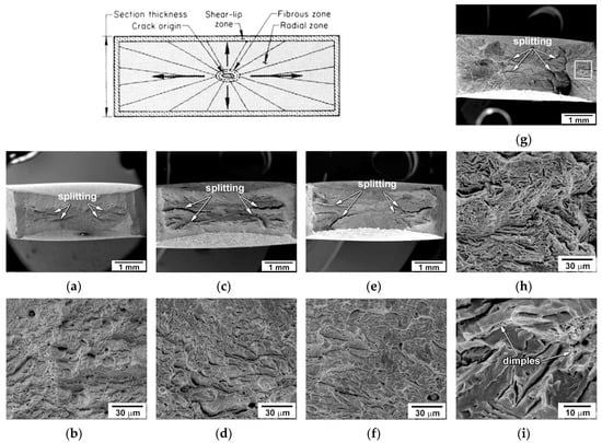 Scanning electron microscopy (SEM) micrographs showing the fracture surfaces of the specimens tensioned at 20 °C (a,b), −40 °C (c,d), −60 °C (e,f), and −140 °C (g,h,i) along with a scheme of the fracture surface markings showing specific areas of rectangular tensile specimen.