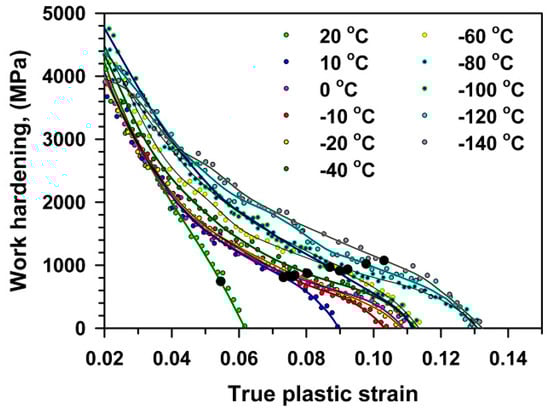 High-chromium steels are a unique material that exhibits a concurrent increase in strength and ductility with decreasing temperature [7]. Uniform elongation increases with a decrease in tensile temperature that is usually related to the increased stability of plastic flow [7,24,28,29]. This presumption is supported by the analysis of the strain-hardening, dσ/dε, calculated as the first derivative of the true stress from the true strain (Figure 8). The strain-hardening during tensile tests can be subdivided into three stages. Those are the first stage of a rapid decrease in dσ/dε at early deformation, the second stage of parabolic strain dependence of dσ/dε and the third stage of accelerated decrease in dσ/dε. It is clearly seen in Figure 9 that the magnitude of dσ/dε increases as temperature decreases. The value of dσ/dε corresponding to the second stage onset increases from 2000 to 2800 MPa with a decrease in temperature from 20 °C to −140 °C. This enhances both uniform elongation and total elongation-to-failure. It is worth noting that P92-type steels exhibit the same work hardening behavior at cryogenic temperatures despite the dominance of quasi-cleavage fracture in the tensioned specimens [7]. The unique temperature effect on the strength and ductility in high-chromium steels is similar to that for fccalloys [7,28]. Therefore, these steels are highly tough in tension down to liquid nitrogen temperature in the absence of a notch, because a high energy is necessary for the formation of critical macrocracks susceptible for unstable propagation.