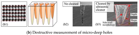 A few studies on the side-wall morphology of micro-deep hole have been performed in metals, however. Two main issues are, first, holes cannot be detected the real-time during the ablation process because metals are not transparent; thus, measurements must be performed afterward. Second, the depth and side-wall morphology of micro-deep holes cannot be directly measured using available methods, such as laser scanning confocal microscopy (LSCM), atomic force microscopy (AFM), and stylus profilometry (SP). Effective measurement methods are destructive and require metal samples first to be ground and polished and subsequently imaged. In this way, the side profile and side-wall morphology of drilled holes have been obtained by scanning electron microscopy (SEM). For example, Li et al. [14] successfully used SEM to examine the depth and side-wall morphology of micro-deep holes in a nickel (Ni) alloy created by femtosecond laser drilling. Similarly, Vahid et al. [15] used a high-resolution X-ray tomography (XRT) to examine micro-deep holes in silicon nitride produced by ultrashort pulsed laser drilling. Now, only the side profile, and not the side-wall morphology, can be effectively analyzed in this way.