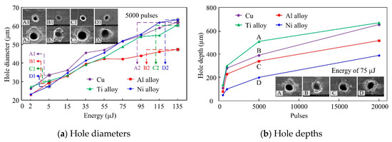 Differences in hole dimensions in the four metals are illustrated in Figure 2, hole diameters varied with the laser energy. When laser energy of 2 µJ was used, hole diameters were similar for the Al alloy and Ni alloy and for the Cu and Ti alloy. Diameters of the Cu and Ti alloy were larger than those of Al alloy and Ni alloy, as shown in Figure 2a. As the laser energy increased while remaining below 55 µJ, very little difference was observed between hole diameters in the Al alloy and Ti alloy. However, when the energy was increased above 55 µJ, hole diameters in the Ti alloy gradually became larger than those in the Al alloy. When the laser energy was less than 75 µJ, hole diameters in Cu were larger than those in the Ni alloy; whereas, the opposite trend was observed once the laser energy increased above 75 µJ. Finally, hole diameters in the order of increasing size were Ni alloy, Cu, Ti alloy, and Al alloy, as shown in Figure 2a. On the other hand, for the depth of the holes, as shown in Figure 2b, The deepest hole was observed in the Ti alloy, and then Cu, followed by the Al alloy, and finally, the Ni alloy.