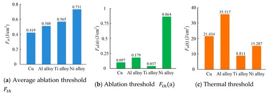 A comparison of the average ablation threshold , ablation threshold , and thermal threshold with single-pulse of the four metals are presented in Figure 4. Many differences can be observed between the material thresholds based on the linear fit for each of the different metals. For example, the Ni alloy was found to have the highest average ablation threshold and ablation threshold but exhibits only the third-highest thermal threshold of the four metals. Instead, the Al alloy has the highest thermal threshold, as shown in Figure 4.