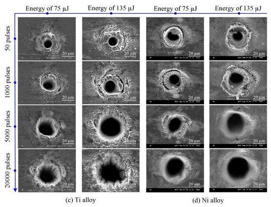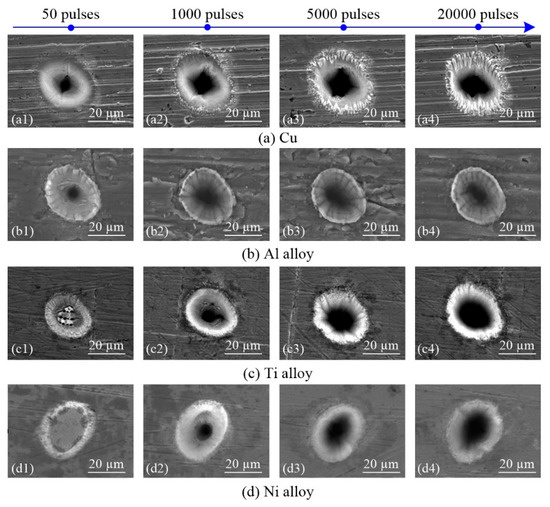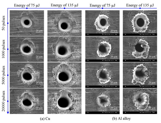 Overall, self-cleaning effects were observed for Al alloy, Ti alloy, and Ni alloy during ultra-short laser pulsed ablation, suggesting that subsequent pulses remove molten material from around the hole surface, thereby obtaining micro-deep holes with high-quality surface morphologies [32]. Furthermore, optimal parameters required to achieve these self-cleaning effects depend on the type of metal, for example, the optimal parameters of Al alloy are energy of 75 µJ and 20,000 pulses, and of Ni-alloy, energy of 135 µJ and 20,000 pulses. However, no self-cleaning effects were observed in Cu in our experiments. The reason may be that unlike the other metals, molten material is distributed throughout the hole instead of building up around the top of the hole.