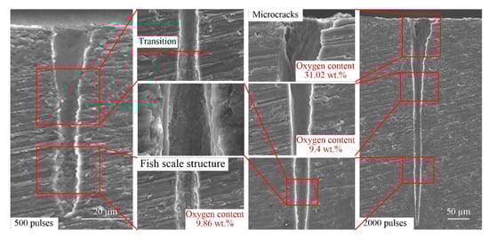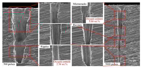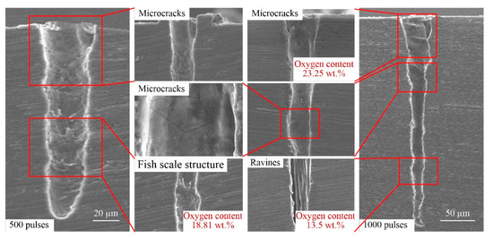 High-intensity laser would ionize air and material particles to form atmospheric plasmas and material plasmas [34]. Plasmas, either on the surface of the hole or inside the hole, would interact with the laser, which would affect the laser beam propagation and its energy state, and then affect the side-wall morphology of the hole. In addition, the plasma is also an energy source and influence the side-wall morphology. Third, the high energy field during laser processing would induce the thermochemical effect, such as oxidation. It could be seen from Figure 7, Figure 8, Figure 9 and Figure 10 that the oxygen content on the side-wall surface was significantly higher than the one of the substrate. At last, there are some effects of thermodynamics of the molten materials with very high temperatures on the side-wall morphology.