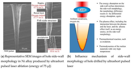 For the formation mechanism of the side-wall morphology of hole drilled by an ultrashort pulsed laser, it mainly contains four aspects, as shown in Figure 10b. First, the laser energy is absorbed by the material, and the material is removed with various states, such as liquid, vapor, and plasma, etc. At this point, the different energy absorbed by different positions of the hole side-wall leads to the difference in the side-wall morphology of the hole. Furthermore, the morphology difference results in differential energy absorption. Second, the plasma effect.
