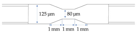 Cleaved 2 to 5 long 125 diameter coreless termination fibers (Thorlabs (Newton, NJ, USA)) were spliced between two bare MM fibers (Thorlabs) with 105 core and 125 cladding using a Fujikura FSM-100P fusion splicer (Tokyo, Japan). To obtain a more favorable modal distribution in the sensing region, the coreless part of the fiber was tapered by simultaneously softening the glass by an arc and pulling the fiber to 80 using the fusion splicer. The resulting dimensions were 1 mm taper length and 1 mm taper-down length on each side, as shown in Figure 1. The taper was found to give higher signal absorption values when compared to untapered pieces experimentally. A possible reason for this is that the transition from the MM fiber to the coreless fiber has a relatively low numerical aperture (lower than the fiber NA, which refers to air) which does not excite higher-order modes to a large degree in the coreless fiber. Although the tapering region is relatively long, it is nonadiabatic due to the closely spaced modes. Therefore, the taper will induce mode coupling and excite higher modes.