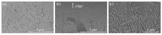 The tapered fibers were coated with Au in an AJA Sputter and Evaporator (Scituate, MA, USA at NTNU, NorFab) with a deposition rate of 5 Å/, with thicknesses varying from 5 nm to 100 nm on one side. This resulted in a continuous gold film on top of the fiber that became thinner and transitioned to gold islands as the fiber surface curved. A semi-film with randomly arranged islands was deposited towards the edge of the film as the fiber curved, as seen with the SEM Apreo (ThermoFisher Scientific (Waltham, MA, USA) at NTNU, NorFab) and shown in Figure 2. As previously reported [,], a semi-film with gaps that allows for in-gap hot spots is ideal for the enhancement provided by SEIRAS. Thus, the imperfection of the film deposited on the fiber is beneficial for field enhancement. For the final absorption measurements, an Au thickness of 100 nm was selected.