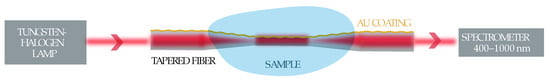 After Au film deposition, the tapered fibers were spliced to pigtailed MM fiber patch cables with the same dimensions as the previously used MM fibers for optimal connection. A broadband halogen lamp (SLS201L, Thorlabs) was connected to one end and illuminated the fiber. The taper and the connected fiber were immersed in an aqueous sample by applying a droplet of the sample on top of the fiber. The change in absorption in the evanescent field was measured with an OceanOptics USB2000 grating spectrometer (Largo, FL, USA) detecting wavelengths from 400 to 1000 nm. The setup is illustrated in Figure 3.
